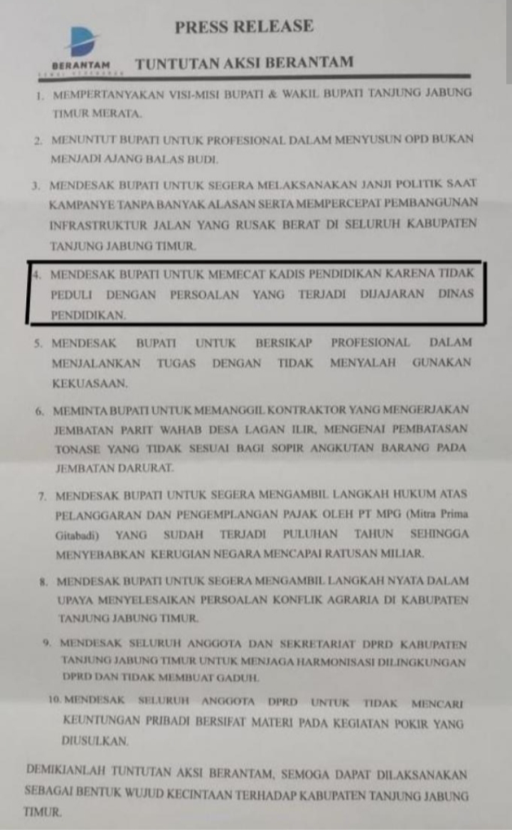 Tekanan pemecatan Kadis yang ditujukan kepada Bupati Tanjabtim, Dillah Hich tersebut, terindikasi sarat dengan kepentingan tertentu, akuntabilitas desakan pemecatan menjadi penting untuk dijelaskan secara transparan, sehingga tidak mengundang seribu tanya bagi kalangan tenaga kependidikan dan publik Tanjabtim umumnya.