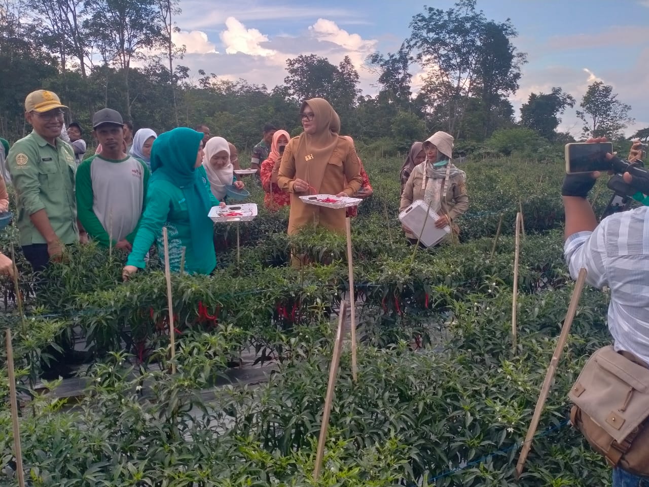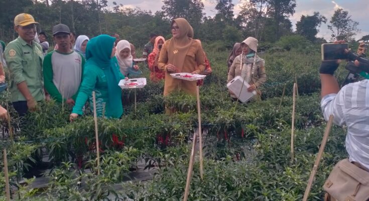 Tanjab Timur|Telago.co.id— Bupati Tanjung Jabung Timur, Hj. Dillah Hikmah Sari, S.T, bersama Wakil Bupati Muslimin Tanja, S.Th.I, M.Si beserta istri, melaksanakan panen raya cabai bersama Kelompok Tani Makmur di Desa Mencolok, Kecamatan Mendahara Ulu, pada Selasa (14/10/2025).