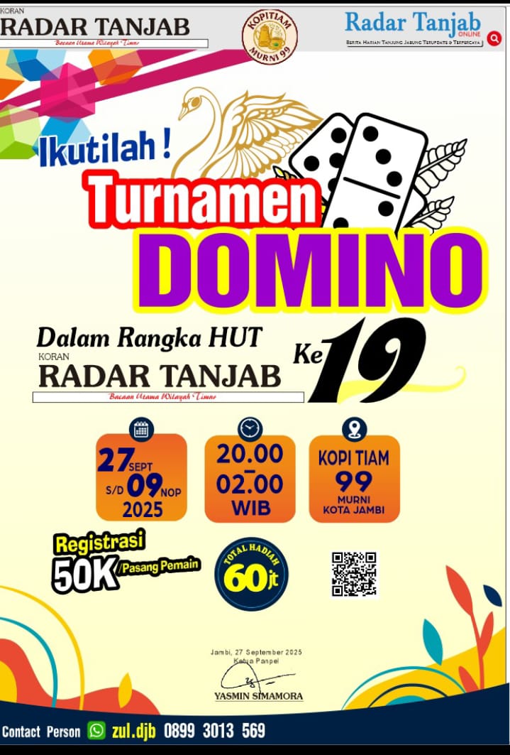 “Momentum turnamen domino ini kiranya dapat menjadi tempat saling mengenal dan saling sapa. Maka dari itu, di HUT RADAR TANJAB ke-19 ini, Kota Jambi kita pilih menjadi tempat pelaksanaan kegiatan turnamen,”ucapnya.
