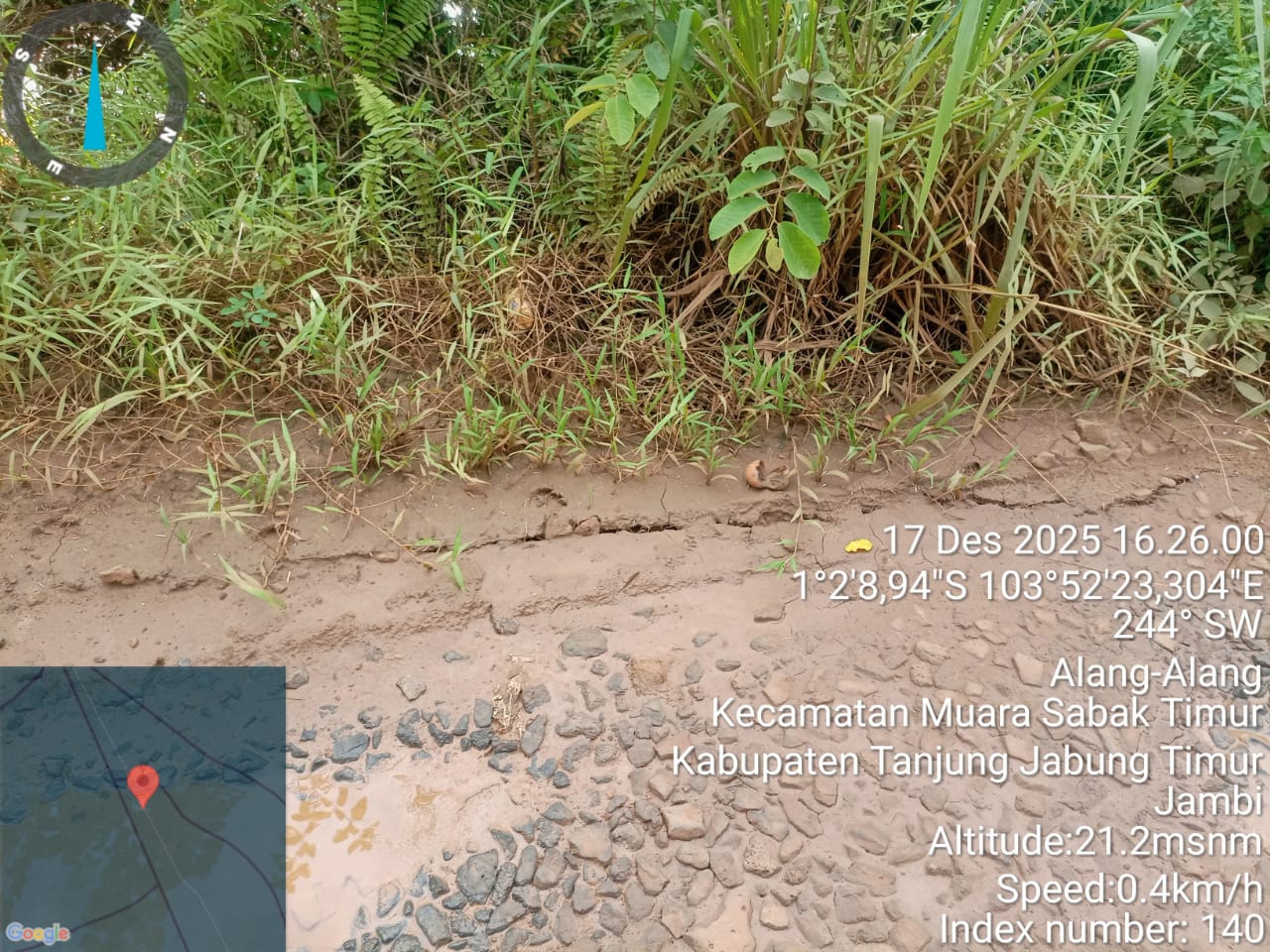 Tanjab Timur|Telago.co.id – Kondisi jalan poros penghubung dari Parit 8 RT 12 Dusun Padaidi hingga Parit Pokkok Desa Alang Alang , Kecamatan Muara Sabak Timur, Kabupaten Tanjung Jabung Timur, kian memprihatinkan. Berdasarkan pantauan di lapangan dan dokumentasi foto, ruas jalan tersebut dipenuhi lubang-lubang besar, genangan air, serta badan jalan yang rusak berat di sejumlah titik, Jumat 26 Desember 2025.