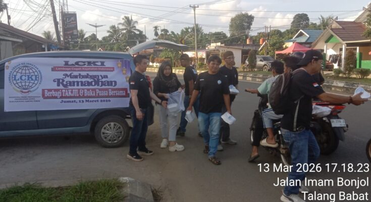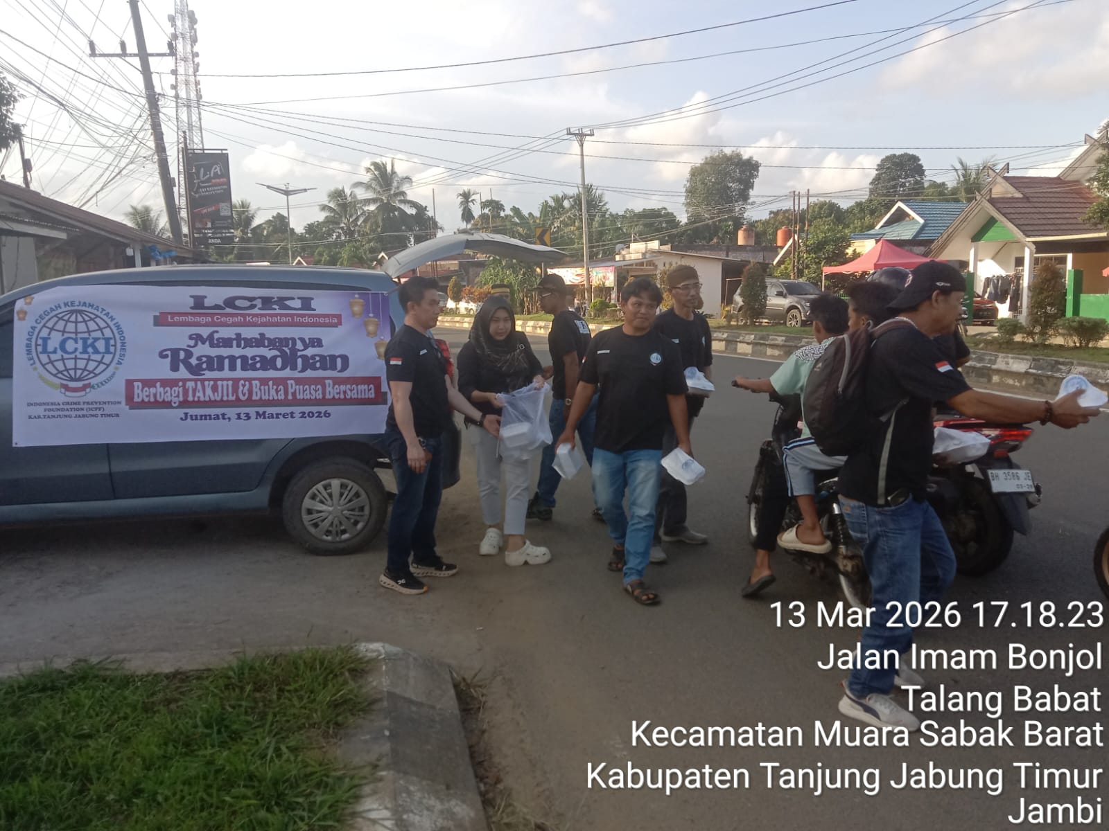 Tanjab Timur|Telago.co.id– Semangat berbagi di bulan suci Ramadhan kembali ditunjukkan oleh pengurus Lembaga Cegah Kejahatan Indonesia (LCKI) Kabupaten Tanjung Jabung Timur dengan menggelar kegiatan pembagian takjil kepada masyarakat, Jumat (13/03/2026).