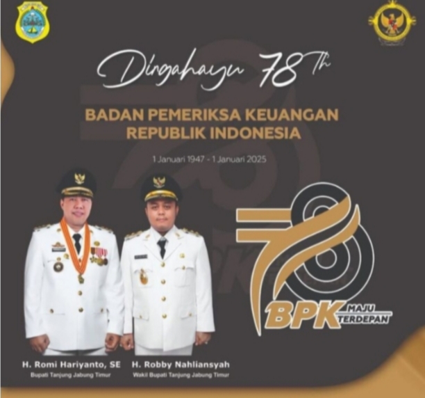 Tanjab Timur|Telago.co.id– Bupati dan Wakil Bupati Tanjung Jabung Timur, H. Romi Hariyanto, SE dan H. Robby Nahliansyah, SH Mengucapkan Selamat Dirgahayu Ke-78 Badan Pemeriksa Keuangan Republik Indonesia ( BPK RI ) 1 Januari 1947 – 1 Januari 2025