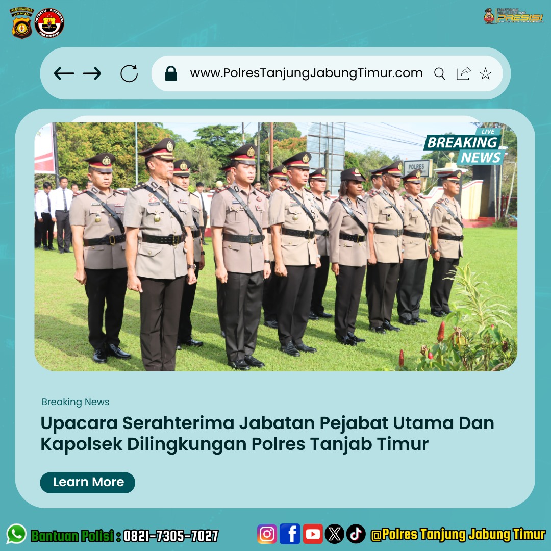 Tanjab Timur|Telago.co.id- Polres Tanjab Timur pagi ini menggelar upacara serahterima Jabatan Pejabat Utama (PJU) dan Kapolsek dilingkungan Polres Tanjab Timur, adapun jabatan yang diserahterimakan dari pejabat lama ke pejabat baru adalah Kabagren dari AKBP Zulkifli, S.H. kepada AKP Iskandar, S.H., Kasat Lantas AKP Maskat Maulana, S.H., M.H. kepada IPTU Meiselin Lobat, S.Tr.K. M.H., Kasat Tahti IPTU Syafriwal, S.E. kepada: IPTU Muis Dermawan, Kapolsek Mendahara Ilir AKP Muhamad Rafisal kepada IPTU Syafriwal, S.E., Kapolsek Mendahara Ulu AKP Rudi Rusadi kepada IPTU Fikrur Riza, S.H., M.H., Kapolsek Geragai IPTU Budi Sitinjak, S.E. kepada IPTU Saryono, S.E., S.Pd. M.M. dan Kapolsek Berbak IPTU Doli Dongoran, S.H. kepada IPDA Hansmadi Simangungsong, kegiatan serahterima jabatan ini dilaksanakan di lapangan apel Mapolres Tanjab Timur, Sabtu (03/05/2025).